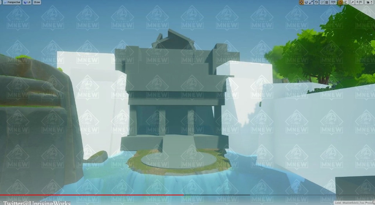 Here's that idea come to life — a large woodland area with two branching paths, a waterfall point of interest, a center island, and a red temple at the intersection leading to the boss arena.